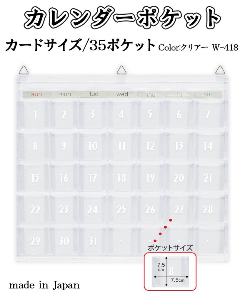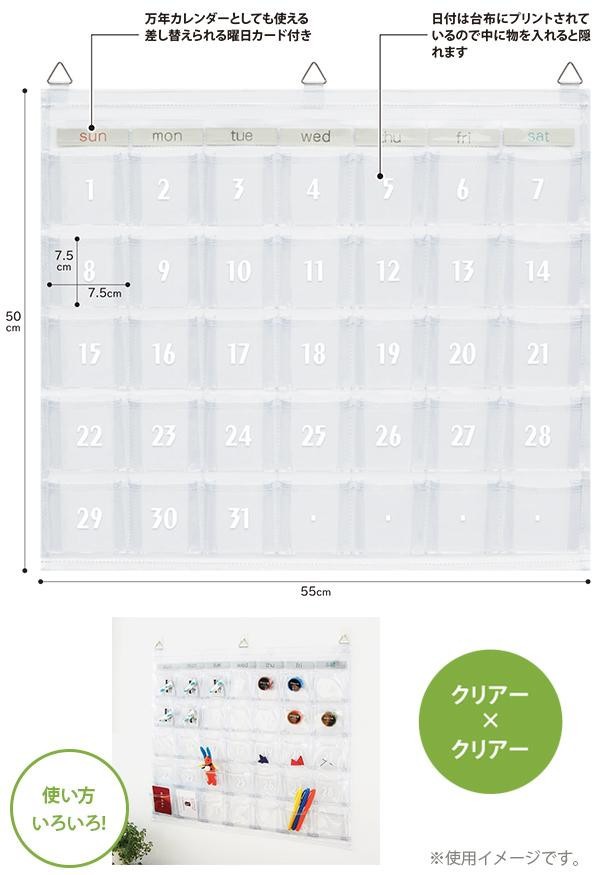 | カードサイズポケットが35個ついたカレンダーポケット日付は台布にプリントしているので 物を入れると日付が隠れます 付属の曜日カードを差し替えれば万年カレンダーとしても使えます 予定に合わせて 忘れがちなハンコやポイントカード 小物を収納するなど色々な用途にご使用いただけます |