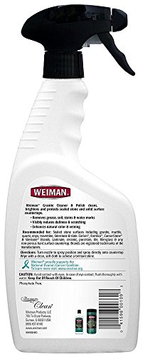 -. Feature : 2-in-1 Cleaner and Polish - Cleans and polishes in one easy step versus using multiple products and additonal steps. Our easy-to-use bottle trigger spray bottle is great for quick spot cleaning or covering a large surface area. / Enhance Natural Color and Veining - Our formula adds depth to your stone surfaces which reveals the beautiful natural veining and patterns in your stone surfaces. / Clean, Brighten and Protect - Weiman Granite Cleaner & Polish safely removes grease, grime and suface stains while visibly reducing surface scratches. It reverses dullness, leaving your stone surfaces brilliantly shining while leaving a protective layer on your countertops. / Streak-Free, Gentle pH Balanced Formula - Our pH balanced, non-acidic formula can be used on all types of stone countertops without worrying about damaging, discoloring, or leaving streaks and watermarks. Won't harm the stone or seal like the harsh chemicals found in all-purpose, glass, acidic or abrasive cleaners can. Our fomula has a light citrus fragrance and is also safe for food preperation surfaces. / Great for Multiple Surfaces - Weiman Granite Cleaner & Polish will clean, shine and protect granite, marble, quartz, onyx, travertine, limestone, slate, laminate, ceramice, porcelain, tile and any non-pourous hard surface.