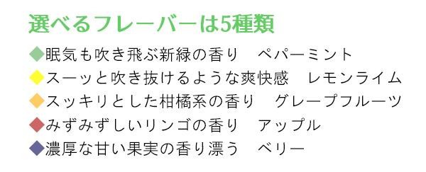 | セット内容 | 5種(ペパーミント、レモンライム、グレープフルーツ、アップル、ベリー)×各3本、什器×1 |
