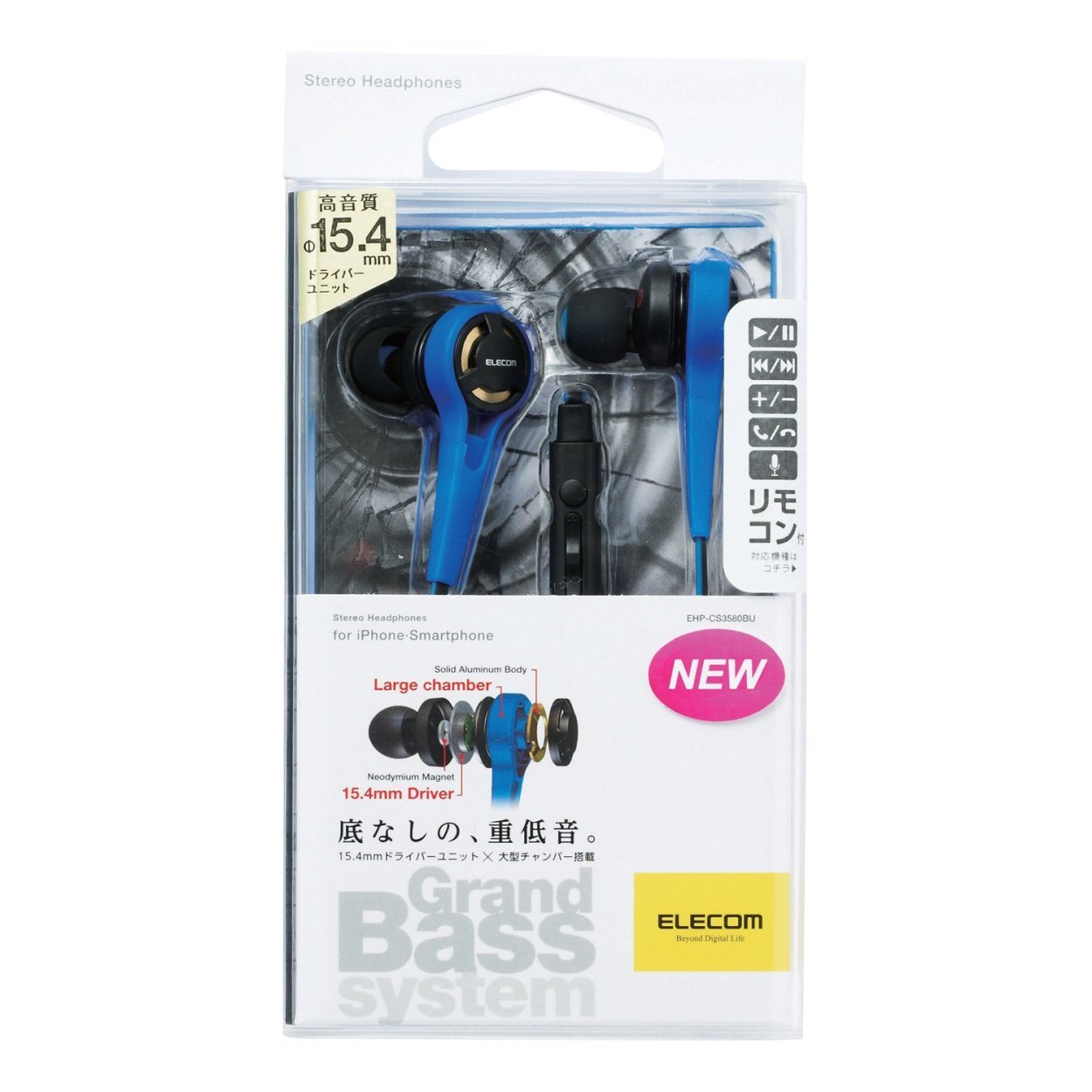 It is a model with a microphone for a smartphone of an ear plug type stereo headphone equipped with the GrandBass system realizing the bottomless deep bass.