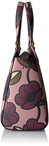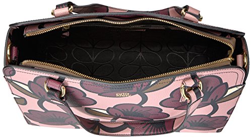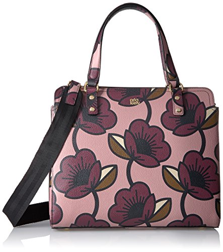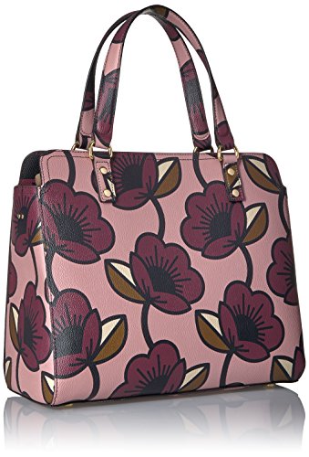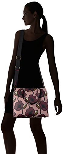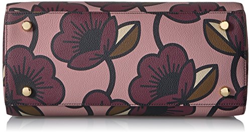 Passion flower' print textured vinyl structured jeanie bag. Bag has zip to close, two small top handles and an adjustable detachable long strap. Gold coloured hardware. Inside details include navy linear stem lining, one zip compartment, two slip pockets and elastic key chain.