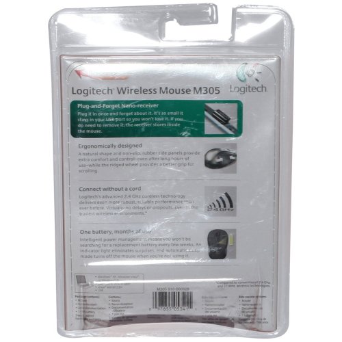 -. Feature : Logitech Wireless Laser Mouse M305 General Features: Silver and black color Wireless / Optical technology Comfortable, ergonomic design 3-buttons Scroll wheel Contoured design / Soft side grips Includes a Logitech Nano Transceiver Runs on one AA battery (not included) / Up to two-year battery life Unit Dimensions: 1.5 x 2.4 x 4.5-inches (H x W x D, approximate) / Regulatory Approvals: