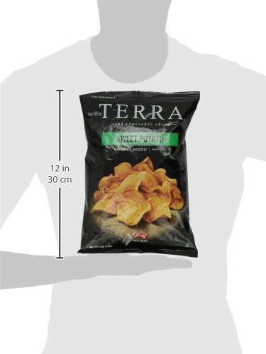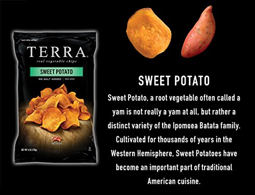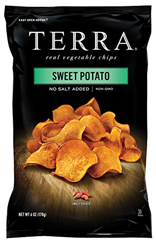 -. Binding : Grocery -. Brand : Terra -. EAN : 0728229345664 -. Feature : Real vegetable chips / Made with sweet potato / Made with non-GMO ingredients / No artificial flavors or preservatives and gluten-free / Kosher certified -. Label : Terra -. Manufacturer : Terra -. ProductGroup : Pantry -. ProductTypeName : GROCERY -. Publisher : Terra -. ReleaseDate : 2016-11-15 -. Studio : Terra -. Title : TERRA Sweet Potato, No Salt Added, 6 Ounce -. UPC : 728229345664