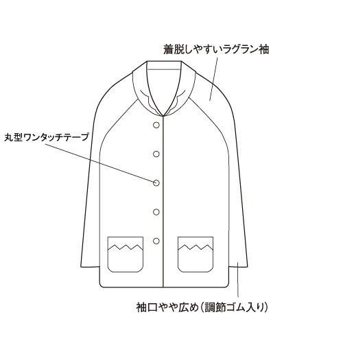 ボタンの代わりに丸型ワンタッチテープ。(飾りボタン付)着脱がらくなラグラン袖で、袖口も広めに。