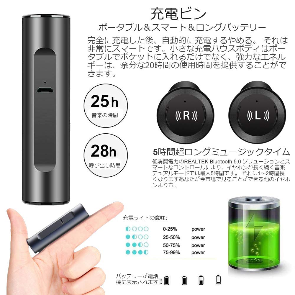 IPX7防水機能&大容量充電収納ケース:IPX7防水機能を備えたので、スポーツ時の汗や雨での使用に耐える防水・防汗性能を備えています。充電機能搭載のコンパクトな収納ケースは、イヤホンを使い終わった後充電ケースに収納して自動的に充電が行われます。満充電の充電ケースでイヤホンを約5回フル充電可能です。最大で約20時間が使用できます 。スポーツ、出張、旅行などには最適です。