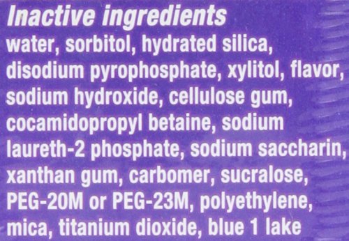 Sodium Fluoride, Water, Sorbitol, Hydrated Silica, Disodium Pyrophosphate, Xylitol, Flavor, Sodium Hydroxide, Cellulose Gum, Cocamidopropyl Betaine, Sodium Laureth-2 Phosphate, Sodium Saccharin, Xanthan Gum, Carbomer, Sucralose, PEG-20M or PEG-23M, Polyethylene, Mica, Titanium Dioxide, Blue 1 Lake