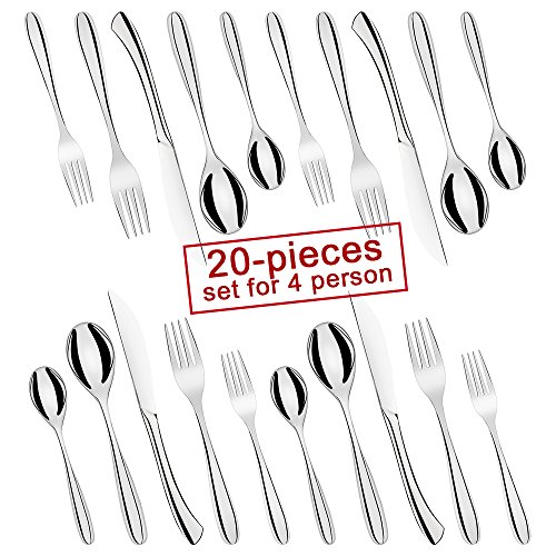 - A COMPLETE SILWARE SET FOR 4 PEOPLE - Empino Provides you with 20-Piece Silverware Set, which includes 4 Dinner Forks, 4 Soup Spoons, 4 Steak Knives, 4 Salad Forks & 4 Teaspoons. This eating utensil set is a Must for an equipped kitchen and it will stand up to the rigors of everyday use.