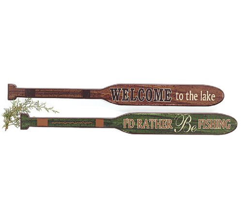 - Oar shaped wood wall hanging that reads "I'd rather be fishing" and "Welcome to the lake".