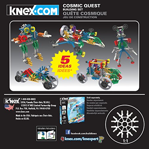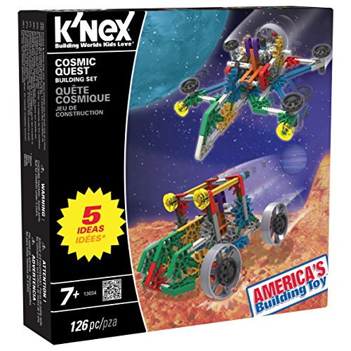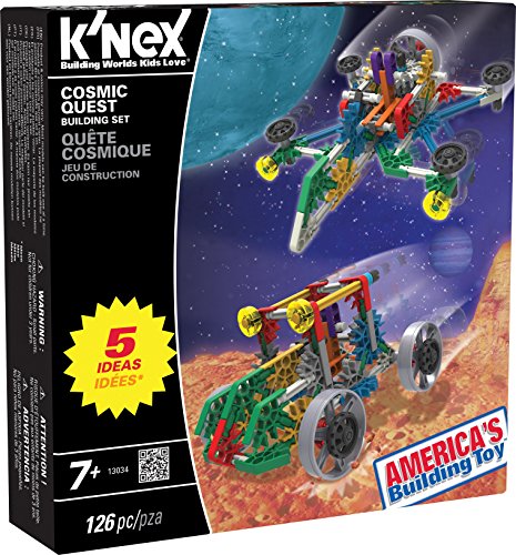 -. Binding : Toy -. Brand : K'Nex -. Department : unisex-child -. EAN : 0698997627517 -. Feature : Includes 5 Building Ideas!|Over 120 Classic K'NEX pieces|Made in the USA|Age 7+ / Over 120 Classic K'NEX pieces|Made in the USA|Age 7+ / Includes 5 space themed building ideas! / Build a Mars Rover, a Hover Craft, an Alien, a Space Suit, or a Moon Bike / Over 120 Classic K'NEX pieces / Made in the USA / Recommended for builders ages 7+ -. IsAdultProduct : 0 -. ItemPartNumber : 13034 -. Label : K'NEX -. Manufacturer : K'NEX -. Model : 13034 -. MPN : 13034 -. PackageQuantity : 1 -. PartNumber : 13034 -. ProductGroup : Toy -. ProductTypeName : TOYS_AND_GAMES -. Publisher : K'NEX -. Studio : K'NEX -. Title : K'nex Cosmic Quest Building Set -. UPC : 698887069144 -. Warranty : Lifetime warranty against manufacturer's defects