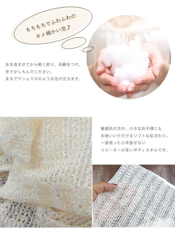 | 泡立ちがきめ細かくフワフワでこしのある泡が立つのが特長です。弱酸性のとうもろこし繊維と日本の技術をつかった編み方で、余分な皮脂汚れだけを落とし、お肌の潤いは逃さずすっきり洗い上げてくれます。敏感肌の方、小さなお子様にもご利用いただけます。 |
