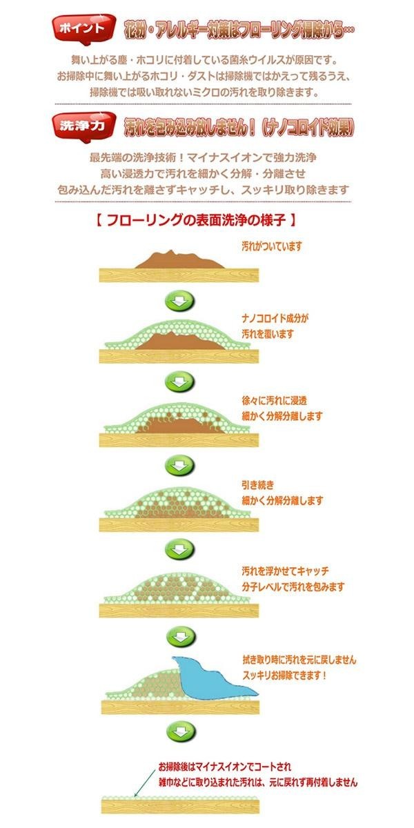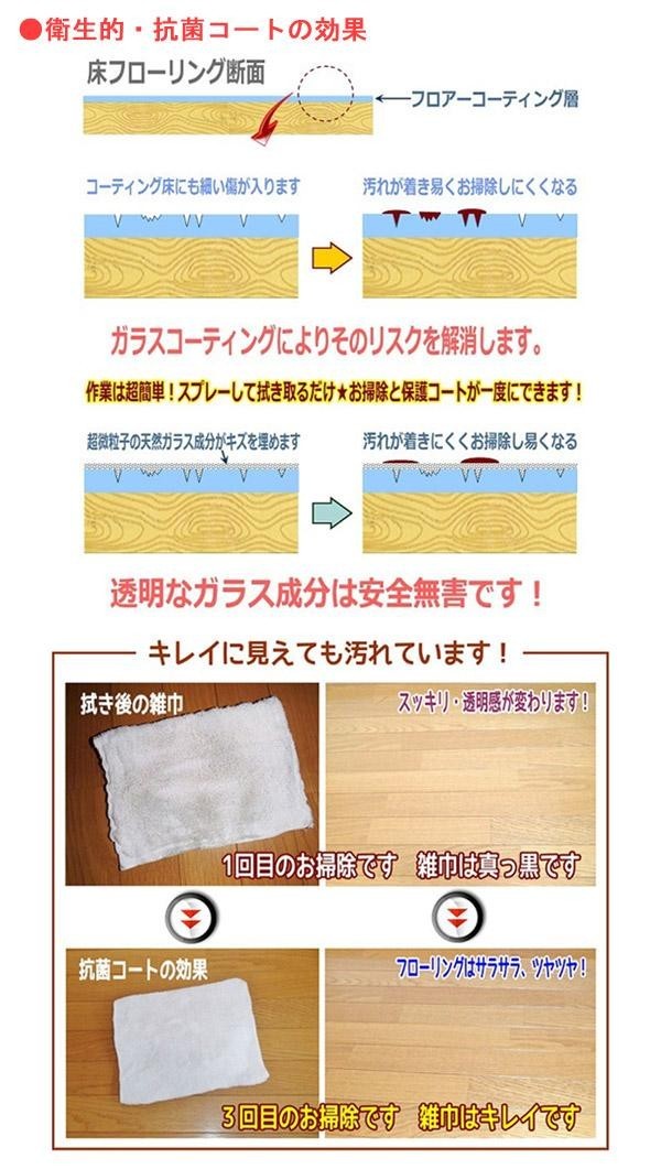 | 化粧品の技術から生まれた、拭き掃除には最適な新技術☆お掃除と艶出し・抗菌コートが一度に出来る、床用洗剤!!フロアーコーティング後の保護・メンテナンスにも最適です。気づいたときに、出来るところだけ♪手間いらずのフローリングメンテナンス☆ |