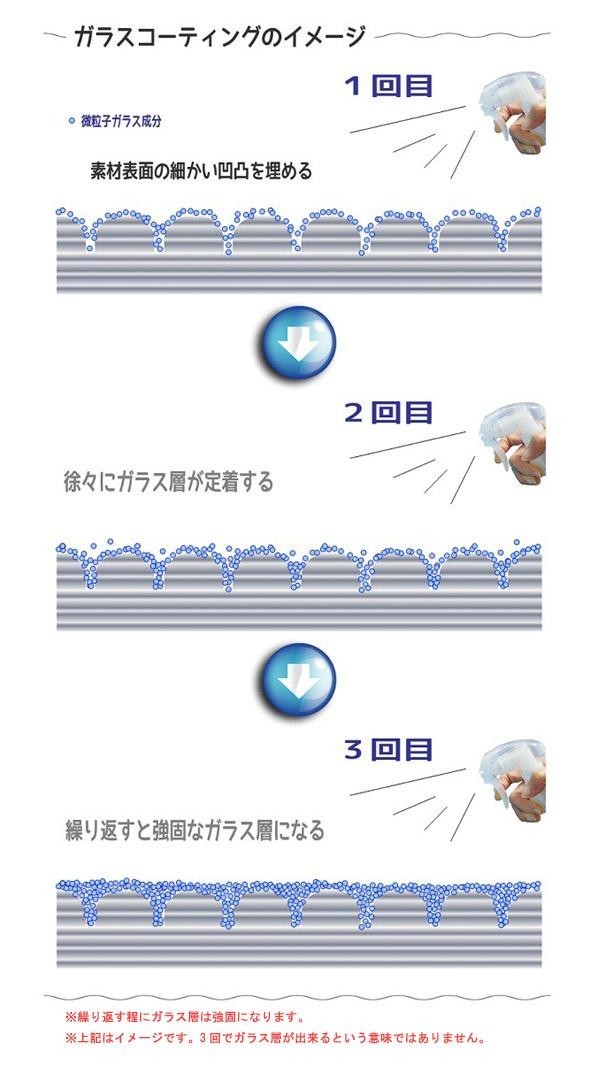| 成分 | 天然無機ガラス成分、特殊電荷水、アルキル珪酸エチレート、非イオン系界面活性剤(天然ヤシ油、天然樹木系)、陰イオン系界面活性剤(2種)、高沸点特殊浸透剤、脂肪酸界面活性剤(非イオン系)、乳化剤、オルソケイ酸ナトリウム、安定剤、香料、艶出し剤 |