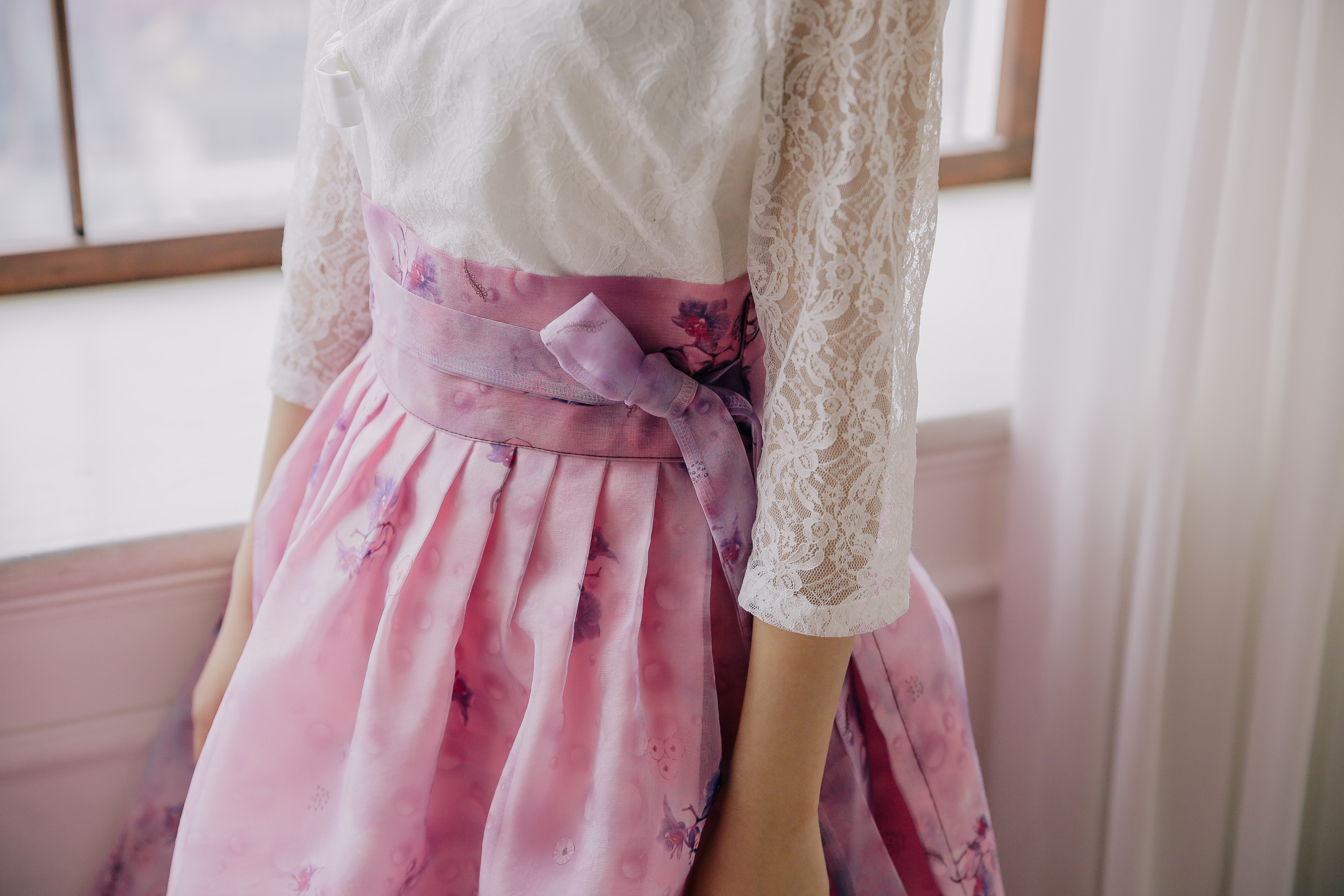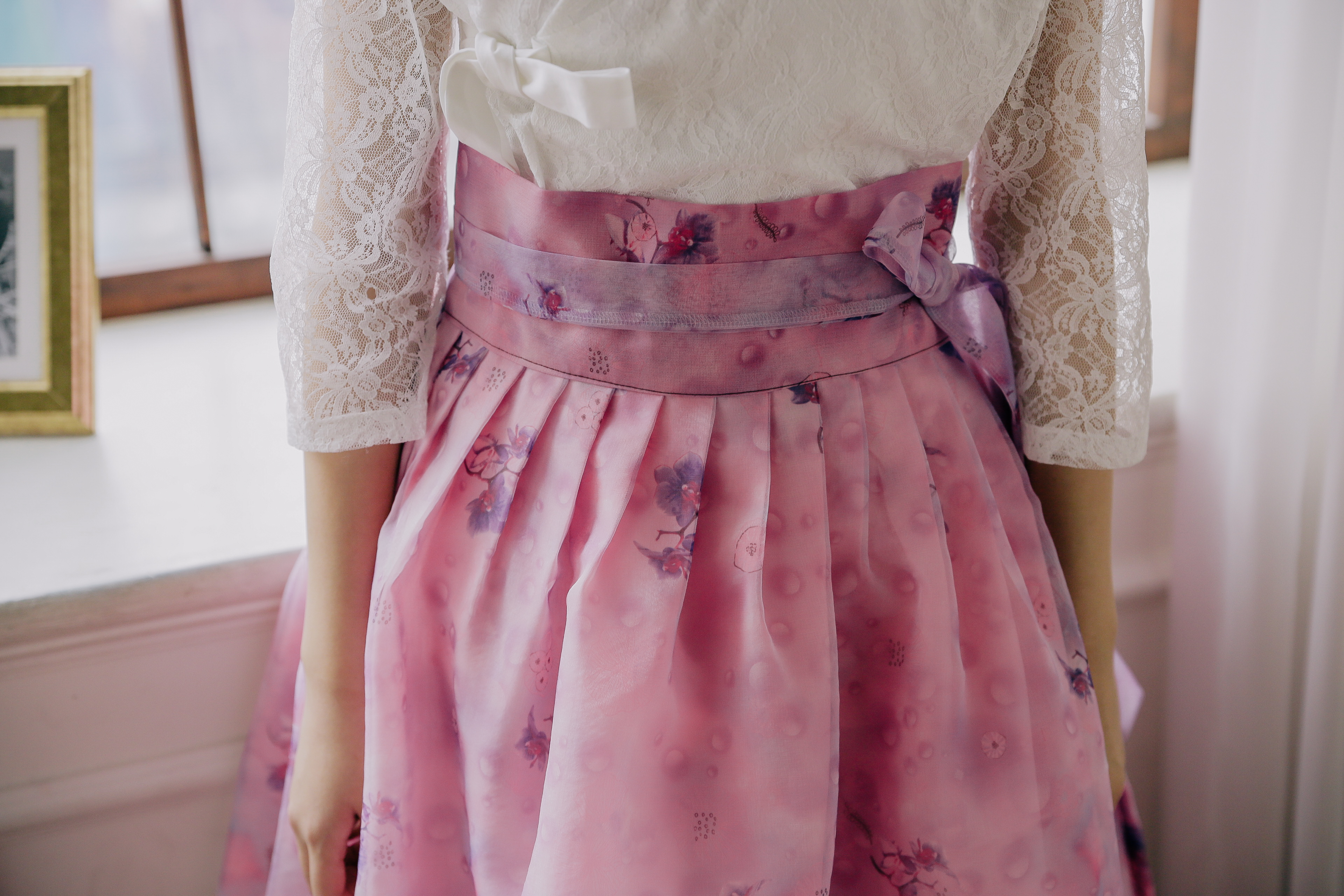 한복원단 중에서 빼놓을 수 없는 게 물모시원단인데요, 이번에 처음으로 물모시 나염원단을 이용해 제작해 봤는데