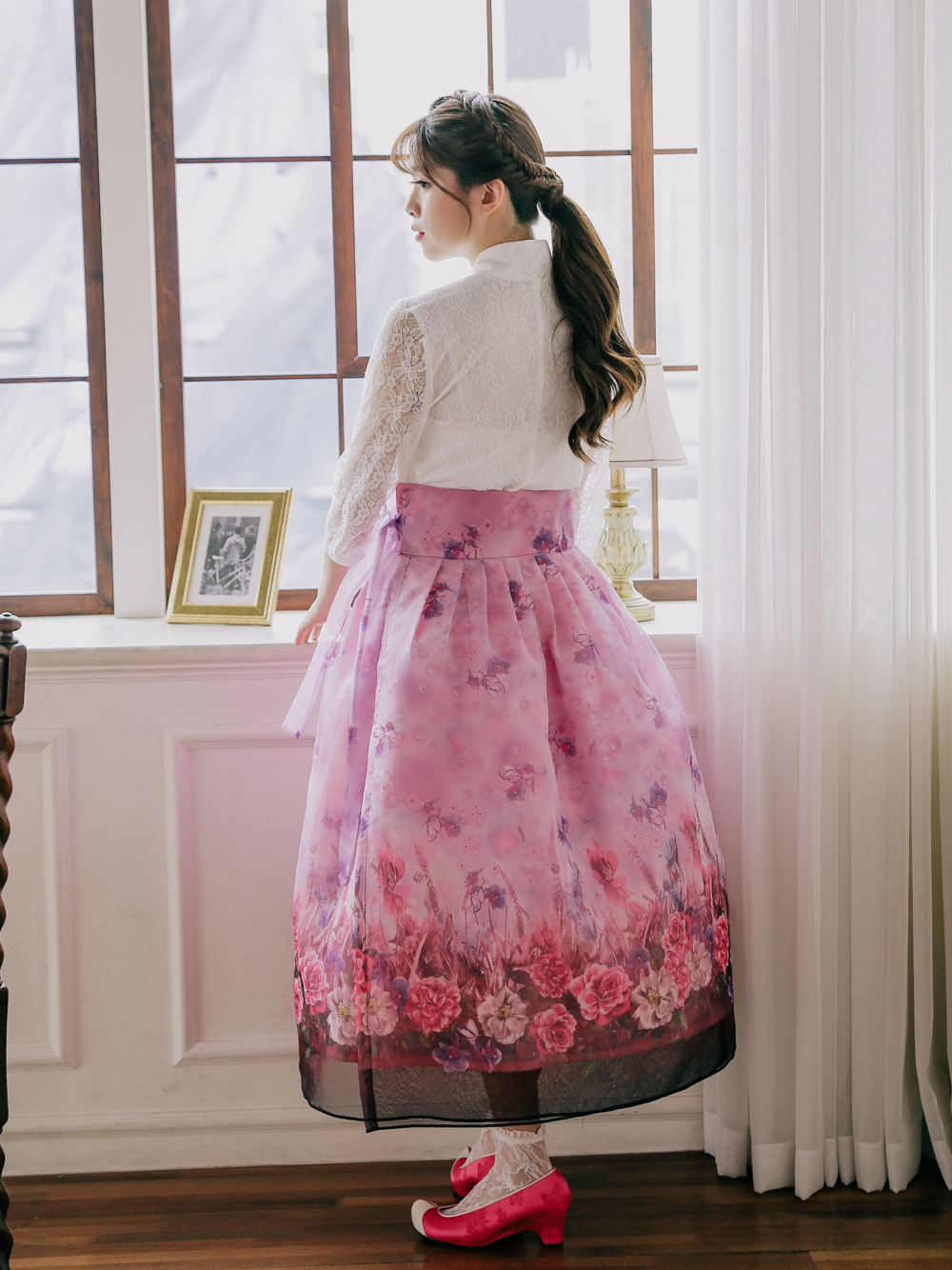 플라워가든-핑크와인 허리치마는 보라빛, 핑크빛,자줏빛의 조합으로 화사함과 봄의 소식을 알리는 아주 예쁜 허리치마랍니다.