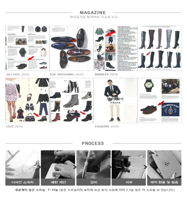 *여성사이즈는 정사이즈 입니다. #160;남성사이즈는 고객님 현재 운동화사이즈가 ex.260→255 한치수 작게 권해드리며, 구두사이즈가 ex.260→260 그대로 입니다. *주문제작일 경우 10일에서 최대 15일정도 소요됩니다. 이점 유의하여 주문 부탁드립니다. 주문제작이 진행되면 출고 전 취소는 불가합니다. *수작업의 특성상 미세한 흠집이나 본드 자국이 있을 수 있습니다. #160;이는 불량 상품이 아니므로, 개인 단순 변심에 의한 교환 및 반품은 불가합니다. *천연가죽의 경우 소재의 특성상 가죽의 질감이나 색상 차이가 있을 수 있습니다. *교환/환불시 택배비 5000원 동봉하시고 접수후 택배 보내주시기 바랍니다. #160;제품의 하자 외의 고객의 단순변심이나 착오로 인한 반품배송료는 고객님께서 부담하셔야 합니다. *모니터의 밝기,해상도에 따라 실제 제품과 약간의 색상 차이가 있을 수 있습니다. *전국 미소페 백화점 아울렛 매장에서 A/S를 받으실 수 있습니다. *문의사항:모다아울렛 울산점 052-935-3012