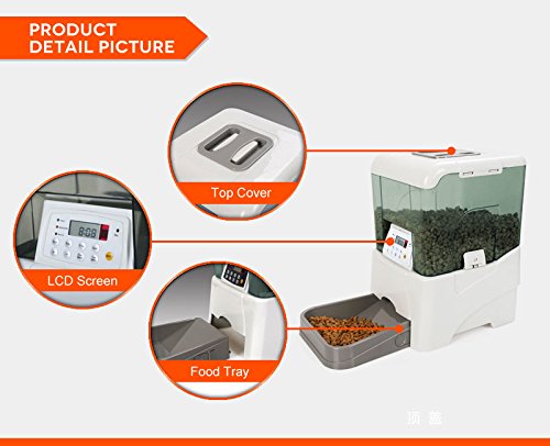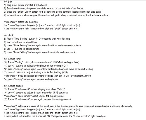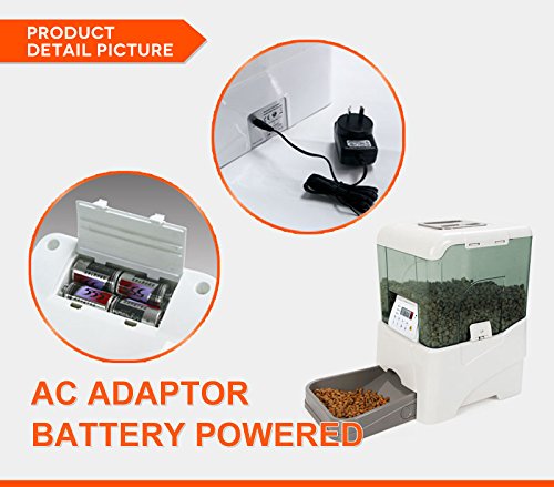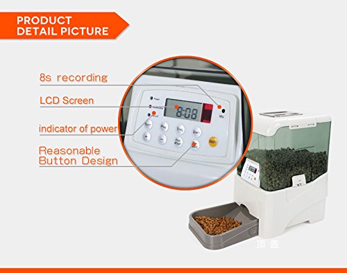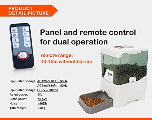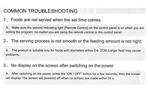 -. Feature : Record a personal message for your pet, up to 8 seconds. Troubleshooting steps attached in teh images / Ant-jamming food-hopper, For all sizes Dogs or Cats. Dry pet food from 1/4" to 1/2" in diameter. / Uses 4 D battery or AC Power, DC Power adaptor is included. / Infrared remote controlled receiving system. Remote range:10-12m without barrier. Programmable portion sizes and feeding frequency. / Large volume - 45 cup (10.65L) capacity, Programmable portion sizes - 1/4 cup to 2 1/2 cups, Programmable feeding from 1 to 5 times daily.
