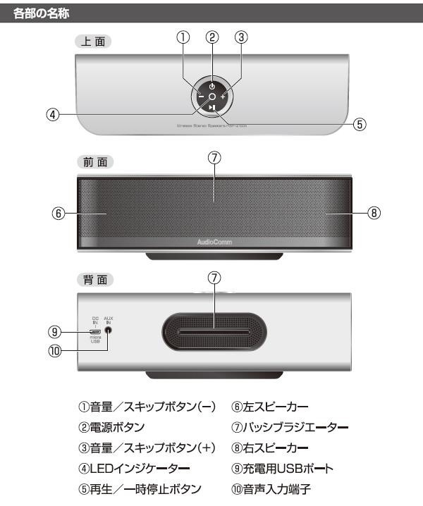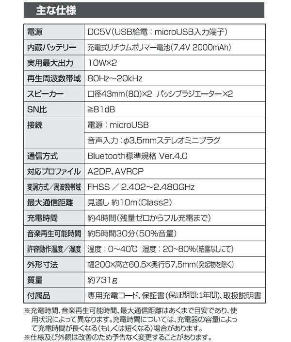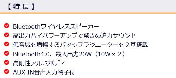 高出力ハイパワーアンプで驚きの迫力サウンドが楽しめるBluetoothワイヤレスステレオスピーカーです。充電式リチウムポリマー電池搭載なので、場所を問わずご使用いただけます♪音声入力端子が付いていますのでBluetoothに対応していない外部機器も直径3.5mmステレオミニプラグコード(別売)を使って接続することにより、音楽を楽しむことができます。 |