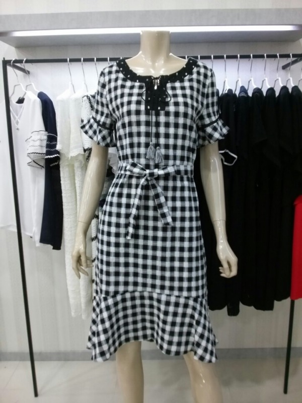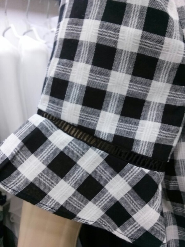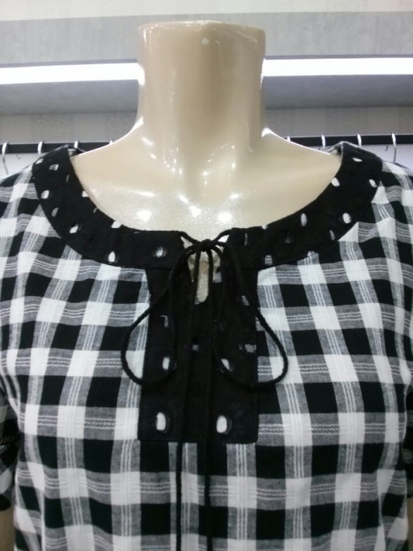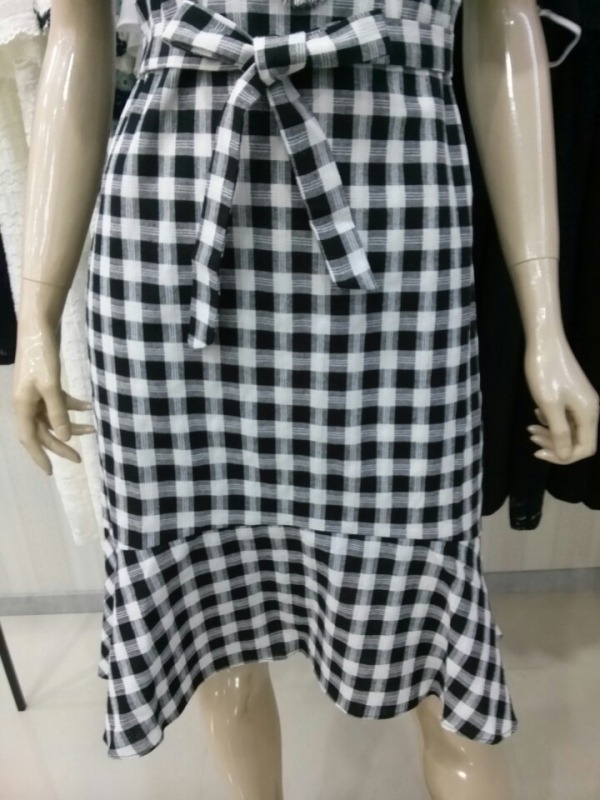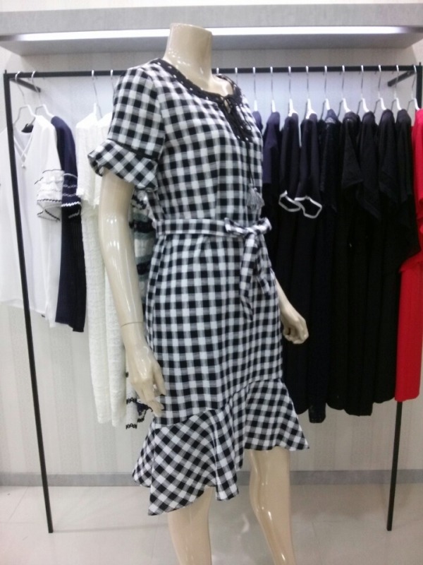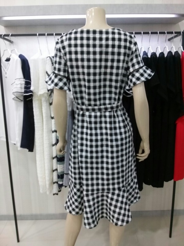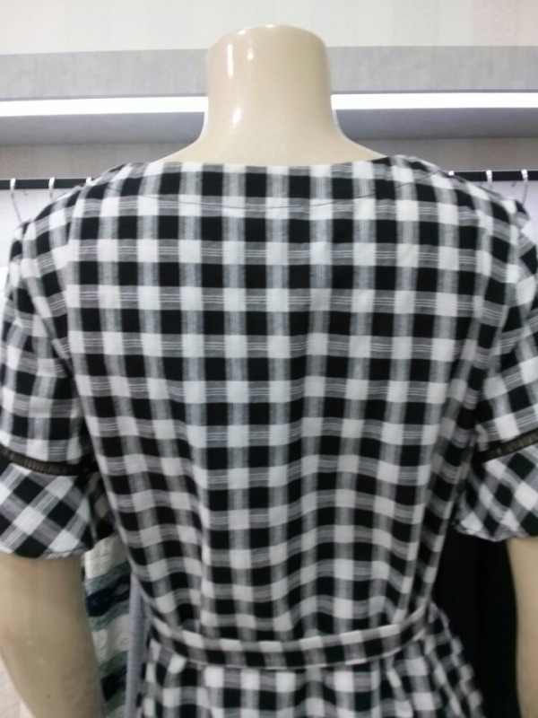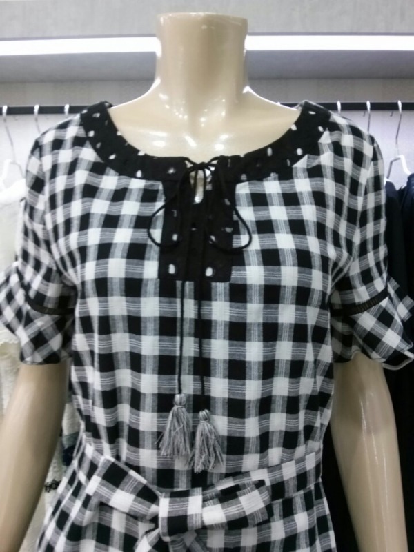 앞뒤 언발란스 기장의 체크원피스^^네크라인 아래의 원형펀칭레이스로 자연스럽게 도트무늬까지 완성된 큐트 원피스예요^^