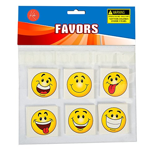-. Feature : KIDSCO PARTY BAG COLLECTION - Whatever your theme or occasion is, find the perfect party bag and fillers here! With an impressive range of themed party bag P.R.Izes. spice up your party favor giveaways and check out all of Kidsco Party Bags Collection! / WHAT YOU GET - Pack of 36 Emoji Goofy Smiley Face Tattoos. Measures 2" each. Comes In assorted emoticons. Packed in transparent poly header bag. For ages 5 and up. / EASY TO APPLY - Start with clean, dry skin. Temporary tattoos are made with water-based ink, which means that they're repelled by skin's natural oils. Pick out your tattoo. Place the image face side down on your skin, hold for at least 60 seconds. Wait for the tattoo to dry. Enjoy wearing these cute tattoos for a couple of days and keep on smiling. / ASSORTED GOOFY SMILES - Choose your favorite smiley and put it in your face or any other part of your body you will have the look of the new trend with these fun and cool party giveaways! / PERFECT FOR - Themed parties, celebrations, party favors, party bag stuffers and gift Ideas for kids. You and your guests will surely enjoy and have fun with these Smiley Face tattoos. It is made up of premium materials so it will last longer and will stick firmly in to your face. These are also great dressing up costumes for Halloween etc.