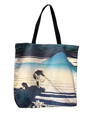 RaanPahMuang Large Japan Shopping Tote Bag Fisherman Under Fuji Japanese WoodPrint