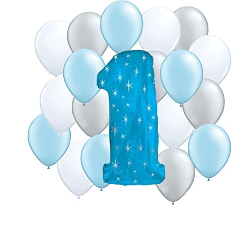 -. Feature : Boy 1st Birthday Party Balloon Kit includes: / (1) 34" Blue Sparkle Number 1 Mylar Balloon / (18) 11" Latex Balloons ~ Silver, White, Blue / Easy, simple party decorations for your first birthday party. / Make a statement at your next party with the First birthday boy balloon kit!