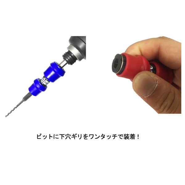 ●高強度・超軽量の六角軸6.35mmタイプのキリ・ドリル、その他の6角軸先端パーツにが使えるインパクト対応下穴ギリ用アダプター。携帯に便利なホルダー付です。