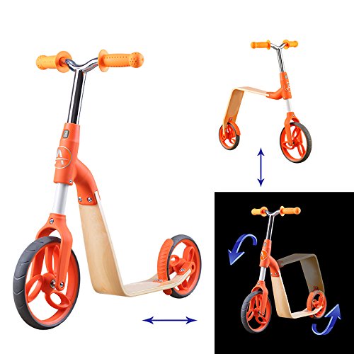 -. Feature : 2 in 1 Function: wooden balance bike and one second convert to mini kick scooter design, Perfect for learning balance, steering, coordination and independence and as a Seamless development towards a pedal bike / Safe design: Parents no more worry the injury of risk for the balance bike as the design is Extremely safe between each parts space and kid can use the legs stand on the ground to ride as their first safe bike / Material: wooden pu and soft TPR, Environmental protection harmless / Up to 55 lbs, pefect for age 3-5, height 95-120cm. / Great Gift for kids, have a interesting childhood