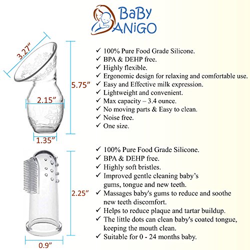-. Feature : ♥ BEST USES: Relieve engorged breasts, increase milk production, saving let down that would otherwise just soak up the breast pads and collect milk from one breast while feeding from the other side - using pure natural suction pressure.. An Anti-dust lid is included to ensure cleanliness of the collected milk. Full Color English Instructions are included for both the Breast Pump and the Finger Toothbrush. / ♥ YOU GET A BABY FINGER TOOTHBRUSH & CASE FOR FREE: Help you relieve your little baby by gently massaging the gums in order to soothe any pain. Highly soft bristles will allow you to carefully clean your baby's new teeth and tongue, to reduce plaque and tartar build-up. The Toothbrush comes in a small plastic case to keep it clean! / ♥ SIMPLE TO USE and CLEAN: One effortless squeeze is enough to create natural suction pressure, and allow your precious breast milk to flow naturally into the milk collector. No more strling with multi-part breast pumps, noise and electricity! No moving parts makes it very easy to keep clean and sterilize, assuring maximum hygiene which is of paramount importance. / ♥ 100% FOOD GRADE, FDA APPROVED, PURE AND HIGHLY FLEXIBLE SILICONE: We Fully Comply and Tested against USA FDA regulations and certified free of BPA, PVC, Phthalate and Lead. Made of 100% food grade, it is 100% safe for your baby! Moreover, it is highly flexible, featuring an ergonomic design. Its quiet operation will allow you to express milk discreetly. Last but not least, it features a 3.4 ounce capacity. / ♥ 100% RISK FREE PURCHASE: Providing you with the highest quality, carefully inspected products and the friendliest customer service is our number one goal. This is why we offer you a lifetime, no questions asked money back guarantee in case this baby manual breast pump does not live up to your expectations. Please feel free to contact us and we will assist you ASAP! PLEASE NOTE:Pump texture design could be different than the one shown in the pictures and on the product box