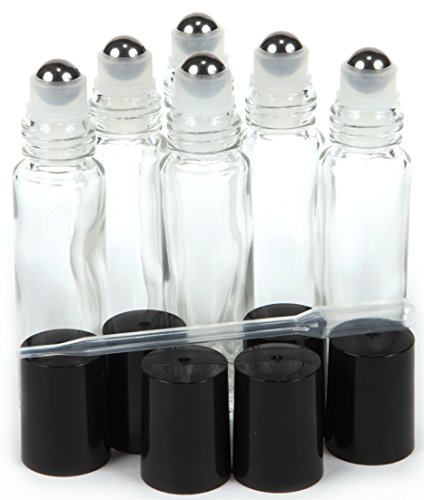 6, Clear, 10 ml Glass Roll-on Bottles with Stainless Steel Roller Balls - .5 ml Dropper included