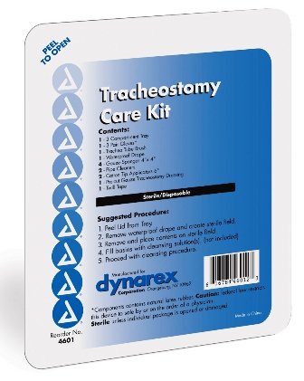 -. Feature : Twill tape 30"; 4 gauze sponges 4 x 4" / 2 cotton tipped applicators 6" / Trachea tube brush, pipe cleaners / Pre-cut gauze tracheostomy dressing / Pair sterile powder free vinyl exam gloves