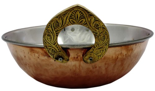 This is a set of 4 open vegetable serving pans called Karahi in India. Bring the curry restaurant experience into your home with these hammered karahi (serving pans) with handles. They are made of high quality stainless steel with an outer layer of copper, making it resistant to heat and corrosion. These karahis are traditional tableware to serve Indian dishes, both dry kind like the biryanis fried vegetables or meat, as well as curry items like chicken curry or daal. Be aware that these karahis have two layers of metal, which enable them to preserve heat for longer duration. Therefore these karahis should be used only as centerpiece serve ware tableware. They should never be used as a cookware. The copper layer will keep the curry warm on the dining table. Double layer of metals with air cushion minimizes heat radiation. With these copper serving utensils, you will be able to give your guests the most authentic feel of traditional Indian dining. The hammering by hand on the copper metal makes it look beautiful. Use this karahi pan along with other copper tableware items to get an authentic Indian dining experience.Care Tips:- Clean your copperware by hand and avoid dishwasher as the detergent can cause oxidation leading to permanent damage. Use a solution of equal quantities vinegar or lemon juice and salt diluted with some water at such times but don't use it regularly. Also avoid scratchy cleaners like steel wool. A simple, soft cleaning liquid on soap base, hot water and a soft washing cloth is best for daily use.