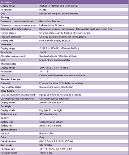 -. Feature : Adopt super-accuracy barometric sensor from Swiss.Remind you automatically when there is a suitable air pressure at fishing place. / Incorporate altimeter, barometer, thermometer, weather forecast and time, date functions, etc. / Six fishing places can be tracked including air pressure, temperature and fishing water depth. / Arrow indication for barometric pressure change.Competition countdown management. / Casting frequency management.EL backlight.3ATM waterproof.