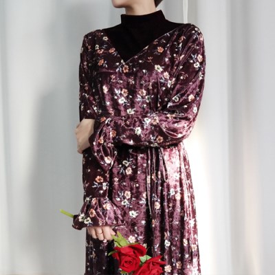 글로시한 벨벳소재의 우아한 무드가 느껴지는 원피스예요. 소재감만으로 특별한 연출을 도와주는 아이템인데요, 은은한 광택감이 느껴지는 벨벳소재로 고급스러움을 더해주었어요!
