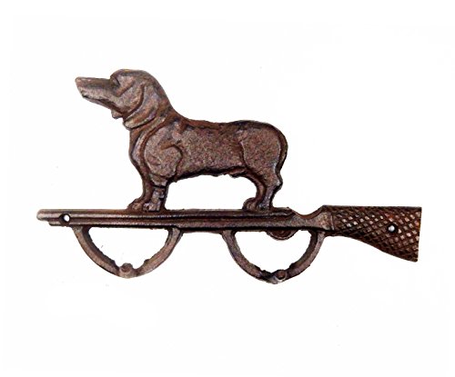 - Dog on gun design solid wall hanger double hooks in brown color vintage or rusty looking - durable to use for hanging key chain, scarf, shirt, necklace and whatever things you want to hang on it.