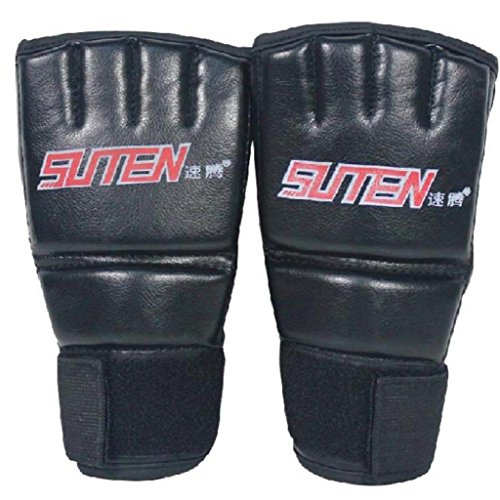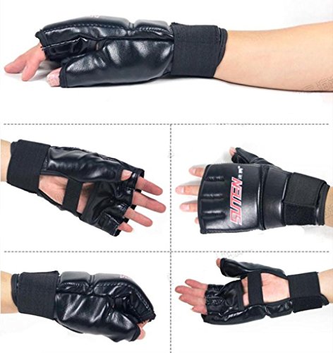 -. Feature : Material: PU Leather. / Adult's type, one size fits most, adjustable, L22cm*W12cm / The back of glove and strap thicken foam, well protecting wrist / Half mitts gloves, empty palm, with nice flexibilty & prevent sweating when train / Designs for MMA or any boxing training