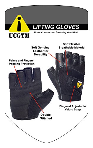 -. Binding : Misc. -. Brand : UCgym -. Feature : DIAGONAL ADJUSTABLE VELCRO STRAP - You can tighten them as much as you like / PADDED PALM AND FINGERS PROTECTION - Adds comfort during weigh lifting and keeps your hands looking nice / DOUBLE STITCHED - Makes them more durable and reliable / MADE OUT OF LEATHER AND SOFT FLEXIBLE BREATHABLE MATERIAL -. IsAutographed : 0 -. IsMemorabilia : 0 -. Label : UCgym inc. -. Manufacturer : UCgym inc. -. ProductGroup : Sports -. ProductTypeName : SPORTING_GOODS -. Publisher : UCgym inc. -. Studio : UCgym inc. -. Title : UCgym Women's Workout Gloves - Great for Gym, Weight Lifting, Crossfit, Cycling
