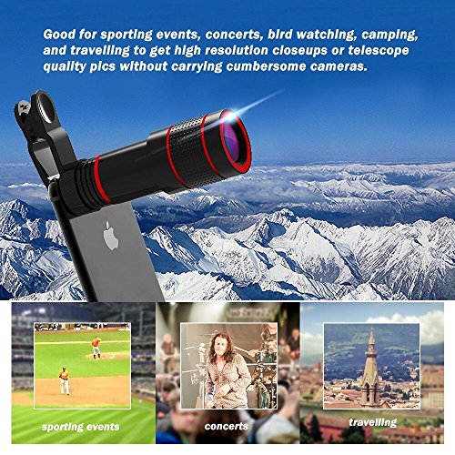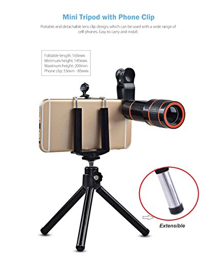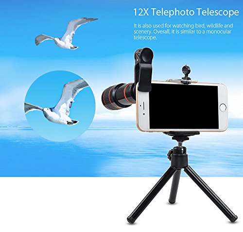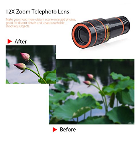 Studio : AtFung Publisher : AtFung Binding : Wireless Phone Accessory Product Description Features 12X zoom telephoto lens will help overcome the limitation of smartphones that can only take near-sighted photos or low quality zoomed images. It's like taking superior quality photos like a pro! Specifications Magnification: 12X Field of view: 70 degree Size: 1.4*3.9" (D*H) Package Included 1 x Zoom Lens 1 x Mini Tripod 2 x Lens Cover 1 x Phone Holder 1 x Universal Clip ? Easy To Use 1. Connect the lens with the clip. 2. Make sure the clip connect center is consistent with phone's camera center. 3. Turn on the phone camera, to see whether it shows full screen view, if not, to make sure lens center and camera center are in one line. 4. Adjust the manual focus ring to get the optimal photo. 5. Use the phone holder and tripod for clear photos avoid hand tremble. Warranty - 18 Months Warranty. ? - 45 Days Money Back Guarantee. - 24 hours Online Customer Service.