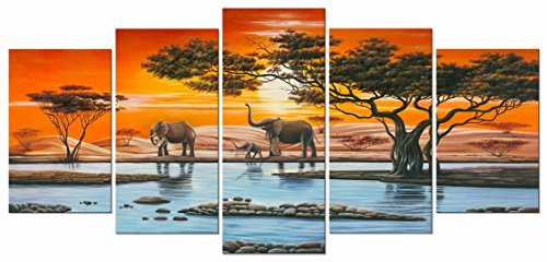 -. Title : Wieco Art - Elephant Family Modern 5 Panel Framed African Landscape Giclee Canvas Prints Artwork Animals Paintings Reproduction Pictures on Canvas Wall Art for Living Room Home Decorations
