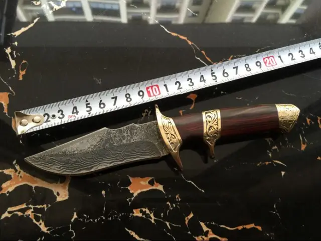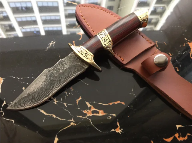 | [해외] 클래식 절묘한 다마스커스 강철 고정 블레이드 직선 칼 순수 구리 핸들 부티크 컬렉션 나이프 야외 캠핑 도구 |