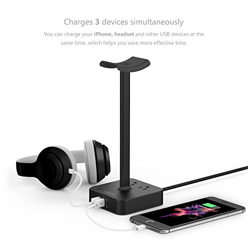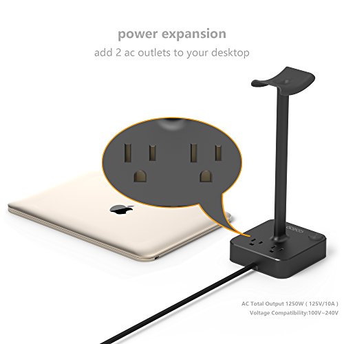 All in one design: Universal headphone stand + 3 USB charging ports(4A/20W) + 2 outlets Power Strip(1250W rated power)