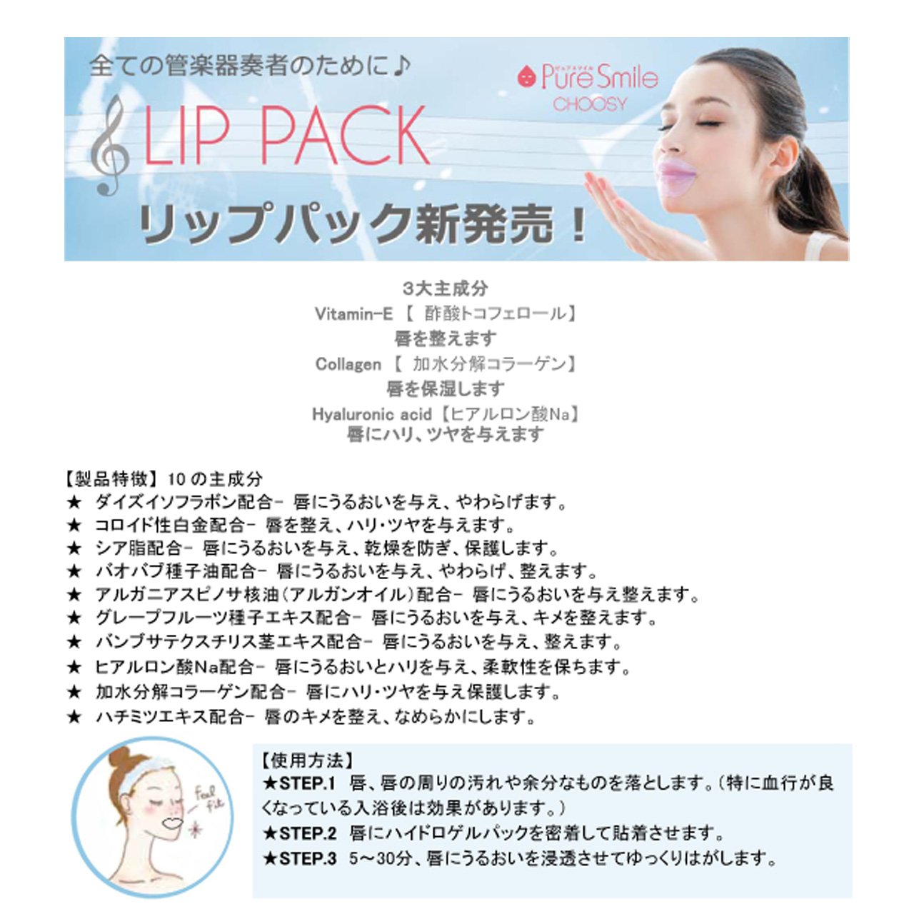 In cooperation with manufacturers, Nonaka Trade cooperates with manufacturers to produce seat type lips packs for all brass instruments, including flute and trumpet players, as well as the season when the lips of autumn and winter dry, before and after the instrumental performance