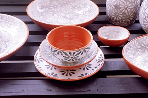 Trendy mix and match Grays that will fit any occasion or relaxed life style. Each piece in the Margarida collection is hand-painted with a unique variation of a Grey and white floral motif contrasted with its beautiful natural colored ceramic. The Terra Cotta is exposed around the rims and on the inside of the pieces showing the clay's natural Color and finished with a transparent glaze. This collection is hand crafted in Portugal and is safe for the dishwasher and microwave.Feature
