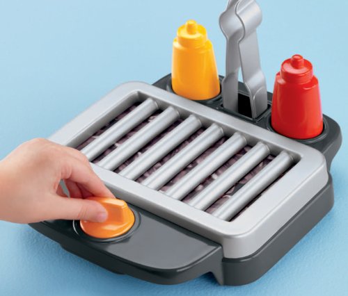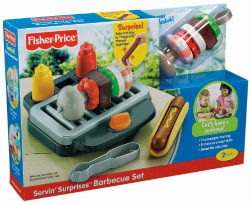 -. Binding : Toy -. Brand : Fisher-P.R.Ice -. EAN : 0746775119379 -. Feature : Contains magical features to be used alone or with the Servin' SurP.R.Ises Kitchen & Table / Grill top that can be turned on and off with a knob / Twist the hot dog to magically change toppings / Make the included kabob and skewer however you like / Combine with the Servin' SurP.R.Ises Kitchen & Table for food specific sung songs and fun phrases -. Label : Fisher P.R.Ice -. Manufacturer : Fisher P.R.Ice -. Model : X2927 -. MPN : X2927 -. PackageQuantity : 1 -. PartNumber : X2927 -. ProductGroup : Toy -. ProductTypeName : TOYS_AND_GAMES -. Publisher : Fisher P.R.Ice -. ReleaseDate : 2012-07-17 -. Studio : Fisher P.R.Ice -. Title : Fisher-P.R.Ice Servin' SurP.R.Ises Barbeque Grill Play Food Set -. UPC : 746775119379 -. Warranty : No Warranty