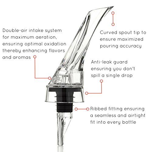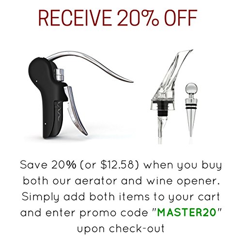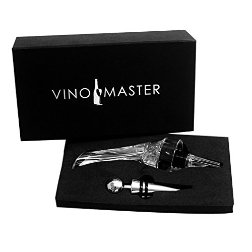 -. Feature : ENJOY GREAT TASTING WINE INSTANTLY - With the VinoMaster Wine Aerating Pourer there is no need to wait for 30 minutes for your wine to breathe like with a traditional decanter. Simply open the bottle, attach the VinoMaster to the bottle, and gently pour as much as you need and get ready to enjoy. As the red wine passes through the dispenser it instantly oxygenates the wine bringing out the complex flavors and aromatic bouquets and therefore making any wine taste better. / THE IDEAL WINE GIFT SET - Looking for wedding favors, or the perfect gift or gadget for wine lovers? The VinoMaster is the best wine aerator for anyone that enjoys wine whether it is a present for a holiday, birthday, anniversary, wedding or any other special occasion. The complete set, inclusive of an elegant wine stopper, is bound to make any wine drinker's day. / INCLUDES UNIQUE WINE BOTTLE STOPPER - Seal the bottle with our heavy and metal wine stopper once you've had enough, so that you can keep the rest for later. The rubber rings on the cork stopper ensure that limited oxygen can enter the bottle, allowing you to preserve your wine for longer. / ELEGANT AND STYLISH DESIGN - Unlike many of the detached aerators you see today which force you to hold the aerator above the wine as you pour, the VinoMaster attaches directly to the bottle ensuring the wine flows effortlessly from bottle into the glass. Additionally, the drop stop leak guard prevents spillage so that you get to enjoy every single drop. The elegant design looks great as an addition to any bar, wine refrigerator, or cellar or when hosting a wine party with your friends. / LIFETIME SATISFACTION GUARANTEE - Start enjoying better tasting wine tomorrow as soon as you VinoMaster arrives. To prove how confident we are with our product, if you are not 100% satisfied, we will refund your entire purchase. Take advantage of our temporary promotional sale price and click the Add to Cart Button now!
