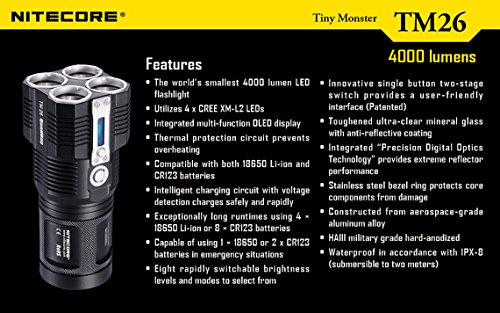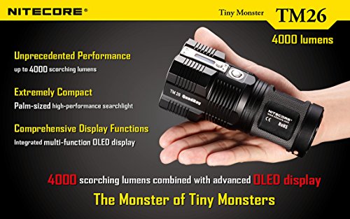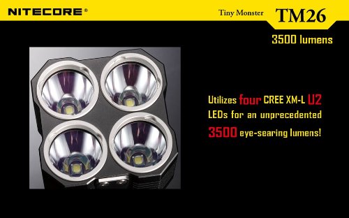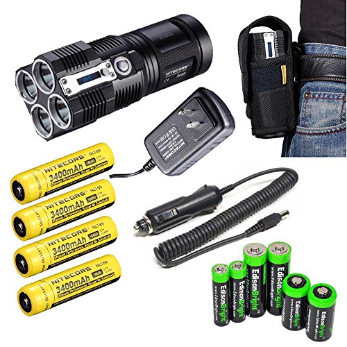 2015 NITECORE TINY MONSTER TM26 QUADRAY 4000 LUMEN QUAD CREE XM-L LED FLASHLIGHT / SEARCHLIGHT WITH 4 X NITECORE NL189 3400MAH 18650 RECHARGEABLE BATTERIES, NITECORE CAR CHARGING ADAPTOR, NITECORE WALL CHARGER, NITECORE HOLSTER AND EDISONBRIGHT BATTERIES SAMPLER PACK
