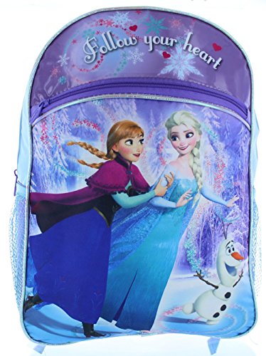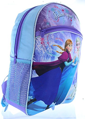 This Disney Frozen backpack can easily carry books, gym clothes, pencils and more! It features a roomy main compartment, the sides feature mesh pockets that are great for storing a calculator, note cards or even a water bottle. This book bag can be hung up when not in use by the webbed locker loop. This backpack is designed in purple durable fabric with accents of blue with a nice graphic of the fun Princess Anna and Queen Elsa! The perfect back to school choice for any Frozen fan!Feature