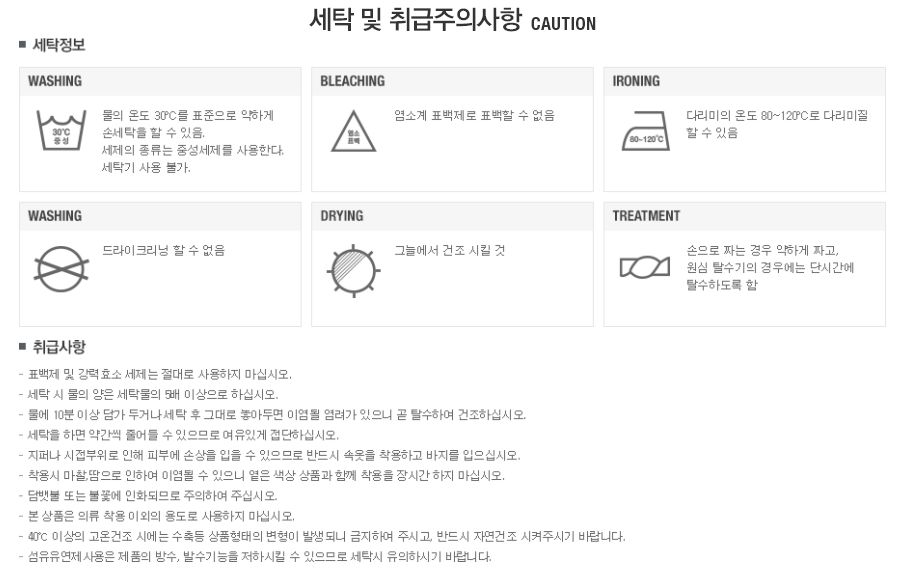 | 세탁 및 취급 주의사항 | 세탁 및 취급 주의사항 탭영역 표시 |