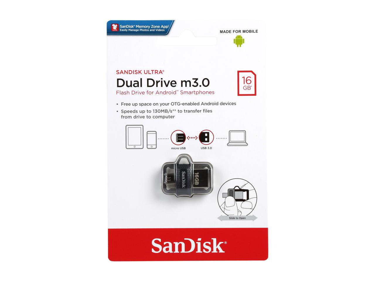 MPN:SDDD3-016G-G46 SanDisk Ultra 16GB USB 3.0 OTG Dual Flash DriveSDDD3-016G-G46INSTANTLY FREE UP SPACE ON YOUR ANDROID SMARTPHONEThe SanDisk Ultra Dual Drive m3.0 makes it easy to transfer content from your phone to your computer. With a micro-USB connector on one end and a USB 3.0 connector on the other, the drive lets you move content easily between your devicesfrom your Android smartphone or tablet to your laptop, PC or Mac computer1. The USB 3.0 connector is high-performance and backward-compatible with USB 2.0 ports. The SanDisk Memory Zone app2 for Android (available on Google Play) helps you manage your devices memory and your content.COMPATIBLE WITH OTG-ENABLED ANDROID DEVICESThe SanDisk Ultra Dual Drive m3.0 is compatible with Android smartphones and tablets featuring OTG (On-The-Go) USB supportFREE UP MEMORY ON YOUR SMARTPHONE AND TABLETQuickly free up space on your Android smartphone or tablet so you can take more pictures and videos.EASILY MOVE CONTENT BETWEEN COMPUTERS AND ANDROID DEVICESThe SanDisk Ultra Dual Drive m3.0 lets you move and share files between Android devices and desktop or laptop computers.DUAL MICRO-USB AND USB 3.0 CONNECTORSSleek, retractable design offers both micro-USB and USB 3.0 connectors. The USB 3.0 connector is high-performance and backward-compatible with USB 2.0 ports.HIGH-SPEED USB 3.0 FOR SUPER-FAST FILE TRANSFERS OF UP TO 150MB/S**High-speed USB 3.0 lets you transfer a full-length movie to the drive faster than with a standard USB 2.0 drive3, up to 150MB/sSANDISK MEMORY ZONE APP FOR EASY FILE MANAGEMENTAvailable from the Google Play store, the SanDisk Memory Zone app lets you view, access, and back up all the files from your phones memory in one location2. It can also automatically move files from your device to your drive to free up space.