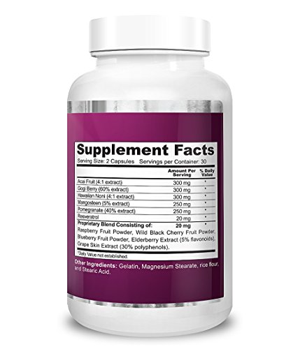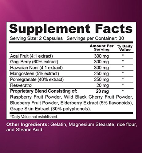 LOADED WITH SUPER FOOD EXTRACTS FOR A NATURAL ANTI-OXIDANT - Acai Berry, Gogi, Hawaiian Noni, Mangosteen, Pomegranate, Resveratrol as well as a multi blend proprietary formula of additional fruit powders