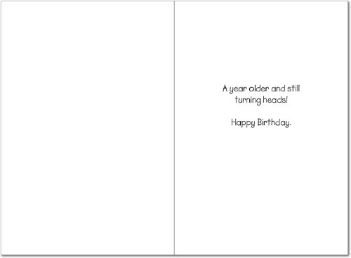 -. Feature : Card's inside greeting: A year older and still turning heads! Happy Birthday. / Big Birthday Wishes Requires a Big 8.5'' by 11'' / Quality P.R.Inting on Heavy card stock in NJ, not in China! / Recycled with a Matching Envelope. / Amazon A-to-Z Guarantee. The only question we might ask is: 'Does your mother know?' Rest assured we'll never tell...